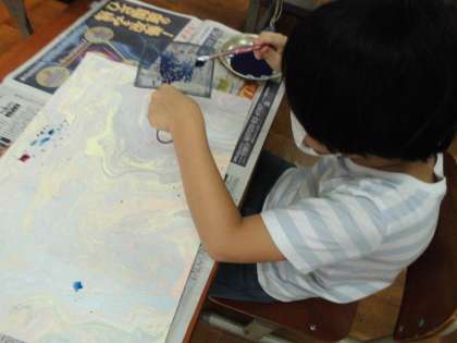 お話の絵の製作に向けて,前回はマーブリングとスタンピングにチャレンジしました。今回は,針金の網になっているものを使って,歯ブラシで細かな点々を描きました。星のきらきらした感じが出てきました。