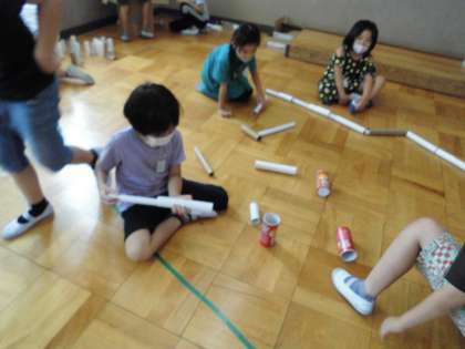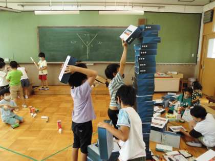 以前から集めていた箱や学校にあった箱などを使って,3つのグループに分かれて学習しました。四角い箱のもの・筒形のもの・カップ型のものなど思い思いのものを使って楽しく活動できました。