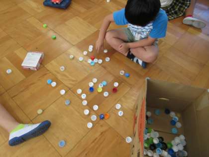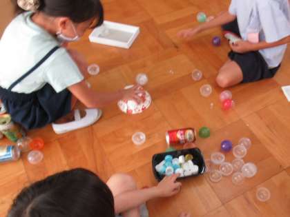 転がしたトイカプセルを空き容器を使ってうまく捕まえる遊びを考えた子たち