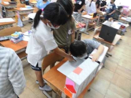 図工の「かざってなにいれよう」の学習で,作品を作りました。どんなところを頑張ったのか,自分で振り返りました。そのあとに友だちの作品の良いところを探して,鑑賞しました。