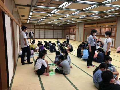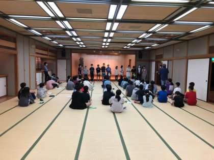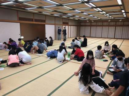 大広間で班別で1日目のふりかえりをした後、班長が発表しました。全員が元気に活動し、クラス、学年の仲間のつながりを深めることができました。