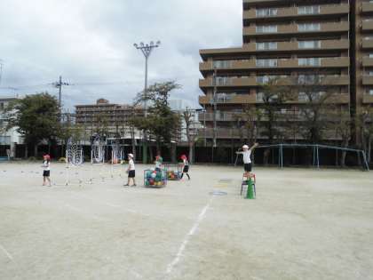 いよいよスタートラインに立って練習開始です。縄跳びやフラフープくぐりなど種目がたくさんありますが,みんな集中して取り組みました。