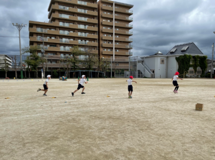 障害物競走ではなわとびを跳んだり,ボールを投げたりと二年生の体育で学んだことを生かして競技をします。