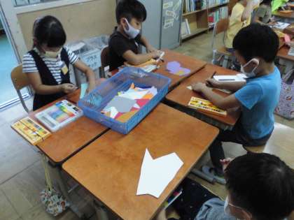 1年生の図工の様子です。様々に切ってある色画用紙の形からイメージを膨らませて,パスや色鉛筆で色を付けていきます。描きながらイメージが膨らんでくるようでした。