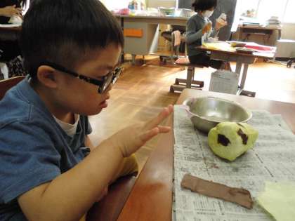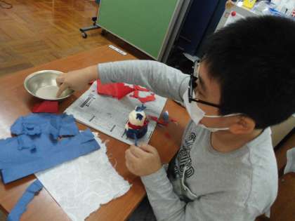 今回は,型の中の和紙が乾くために時間がかかるので,垣口先生が事前に作ってきていただいた人形の形を貼り合わせて,色の和紙を貼って彩色しました。