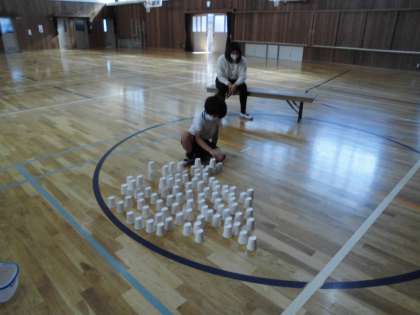 2種目目は,紙コップタワーです。10個の紙コップを使うグループと3個の紙コップを使うグループとに分かれ,自己ベストを目指して頑張りました。