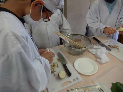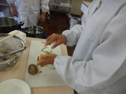 家庭科の調理実習では,ほうれん草とじゃがいもを茹でました。包丁やピーラーの使い方に気を付けて野菜の皮をむいたり,切ったりしました。山の家の野外炊事でも,じゃがいもや人参,たまねぎを切るので,ご家庭でも食事を作る際に.一緒にしていただけると助かります。