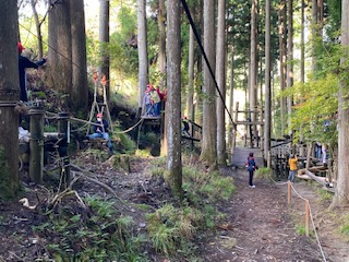 はしごを慎重に登って、丸太の上をロープを頼りに下りてきます。