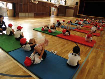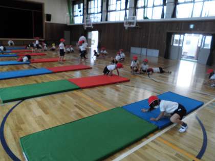 準備運動として,ゆりかごや川渡り。両足を後ろ上で1回たたきなどをしました。それから,前転・後転の練習をしました。
