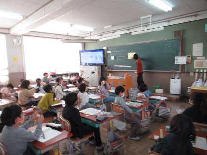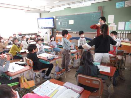 「むかいあう辺」を理解するために子どもたちに協力してもらって手を広げて四角形をつくりました。