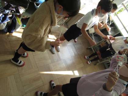 国語の学習で作ったブンブンごまが2年生の中でブームになっているようです。