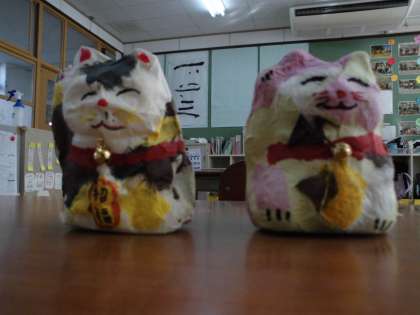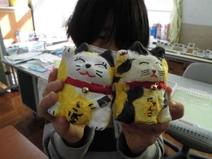 以前に垣口先生からご指導いただき,そのあとで自分たちで製作した「招き猫」も出来上がりました。