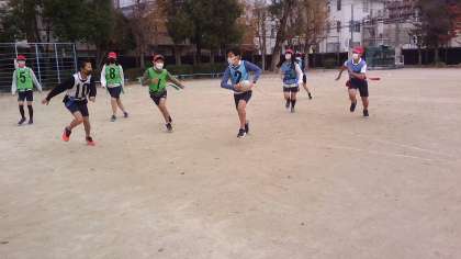 最後のタグラグビーの授業でした。初めに比べて,チームの動きが非常によくなりました。どうしていいかわからず固まっていたり,棒立ちだったたりしたのが,チームごとの作戦に従って動いていて,面白い試合になりました。普段なかなかトライを決めることのない子どももトライを決めており,振返りでは,「チーム全員が一回はトライを決められ,みんなでやるタグラグビーの楽しさが分かりました。」と,素敵な感想が見られました。一人一人が生きる,そんな姿が垣間見れ,とても有意義な授業でした。