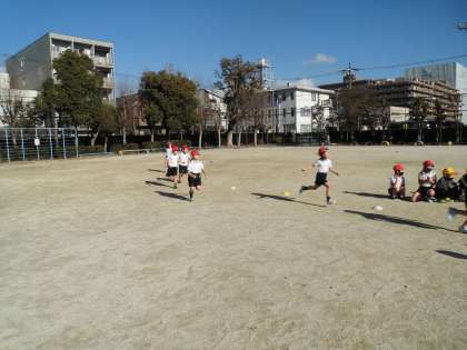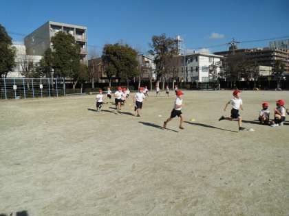 体育科で「ゆっくりかけあし」を学習しています。