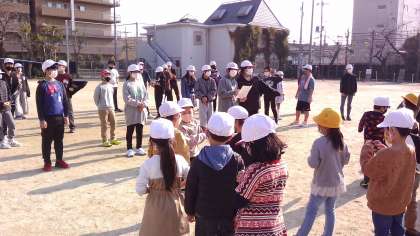 運動場では,司会の進行ではじめの言葉,最初のあそび「ふえおに」の説明と進みます。