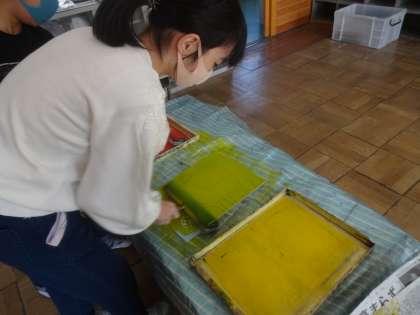 色をつける順番を確認しながら一生懸命に彫り進めいます。