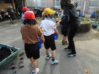 アサガオで使っていた鉢を再利用です。春に向けてチューリップの球根を植えました。アサガオで使った土を,石灰と肥料を入れて混ぜ合わせました。春にきれいな花が咲くのが楽しみです。