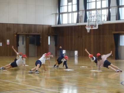 体育「パワーアップ体操」では,音楽に合わせて各グループが考えた体操を発表しています。グループで協力して工夫を凝らして臨んでいます。
