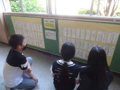 「ふれあいコーナー」では、毎月10日のふれあいタイムに合わせて人権に関わる作品を掲示しています。今月は6年生が担当です。5月2日の朝会での校長先生の話(基本的人権の尊重や平和主義など日本国憲法について)をもとに一人ひとりが意識したい人権目標を考えました。「チーム・プレーを大切にしたい,相手意識を大切にしたい」など,人との関わりにおいて意識したいことを書いていました。5月中掲示していますので来校された際には是非見て下さい。