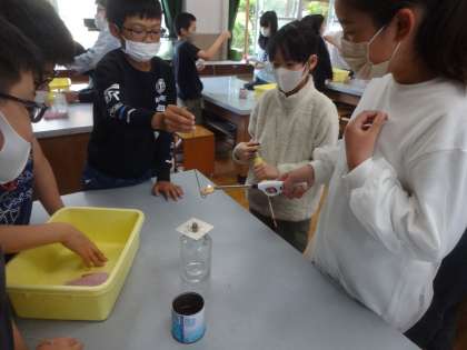 気体検知管を使い,ものが燃える前と燃えた後の酸素や二酸化炭素の割合について実験しています。ものが燃えた後の酸素と二酸化炭素の割合の変化に着目して学ぶことができました。