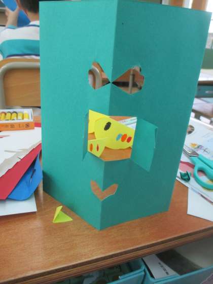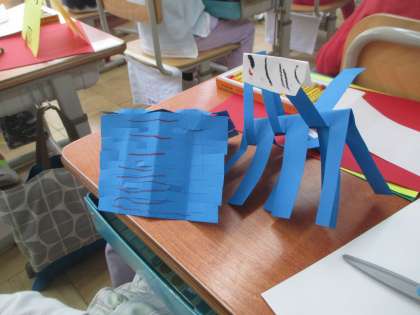 先週までの練習とは違って,パスを使って,模様を書き入れました。そうすると,「〇〇に見える!」と,より世界が広がったようです。友だちの作品を見ては,「すごい!」と声が上がったり,「どうやって切ったら,あんなふうになるんやろう。」と悩んだり,良い刺激を受けていたようです。