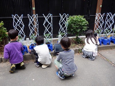先週植えたミニトマトの観察をしました。タブレットで写真にも撮って記録に残しました。