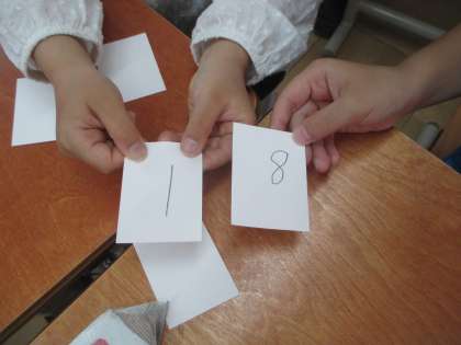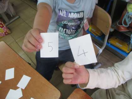 今日は,『9はいくつといくつ』のゲームをしました。数カードをつくり,裏返したカードをめくって,9をつくりました。なかなかそろわず,苦戦する様子も見られました。しかし,だんだんと「そろったよ!」や,「4と5で9になったよ。」など,ゲームを楽しみながら,数の構成を理解していた子どもたちです。