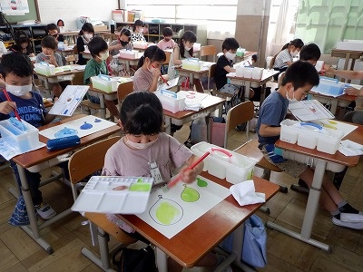 「(筆洗の)すすぎの水はほとんど汚さず使えたよ!」「(画用紙に)はみ出さずに色を塗れたよ!」子どもたちの「できた!」がたくさん聞けた2時間でした。