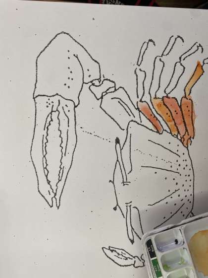 しゅう色の1色を使って,カニの絵に色をぬりました。