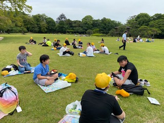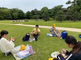 広々とした芝生に座って、おにぎり弁当を食べました。