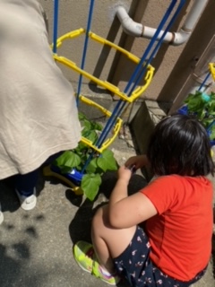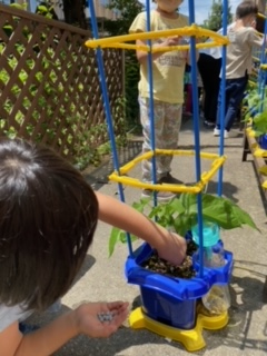暑い日差しにもまけず,ぐんぐん成長しているあさがお。つるが伸び始めたので,支柱を立てました。そして,追肥もしました。「葉っぱが大きくなってたよ。」,「先っぽに,花みたいなのがついてたよ。」と,毎朝の水やりの時にも観察を欠かさない子どもたち。