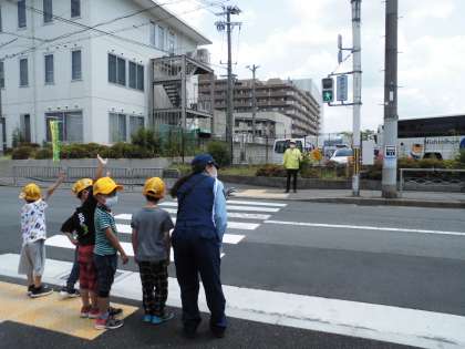 安全な道路の歩き方や横断歩道の渡り方等を教えていただき,その後は,学校の周辺の道路をグループごとに歩きました。