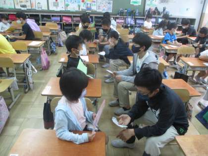 3時間目に,6年生との交流をしました。待ちに待った交流で,始まる前は,「緊張する。」と言っていた子もたくさんいました。しかし,いざ交流が始まると,6年生の計画委員会の人が盛り上げてくれ,笑顔で話をする姿が見られました。