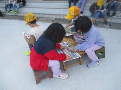 本を選んだあとは、持ってきてくださった椅子に座って本を読んだり、体育館横の階段に座って本を読んだり、とても素敵な時間になったようです。