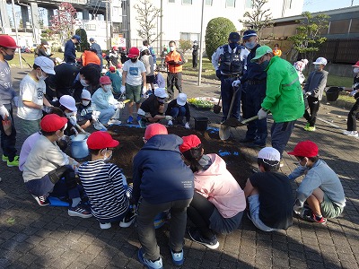 5年生は、「西大路駅周辺を美しくする会」の方主催の「花いっぱい運動」に参加しました。今年度2回目の活動で、西大路駅近くのYouYouパークで、地域、地元の企業、関係機関の皆様と一緒に祥豊小学校で育てた花を植えました。