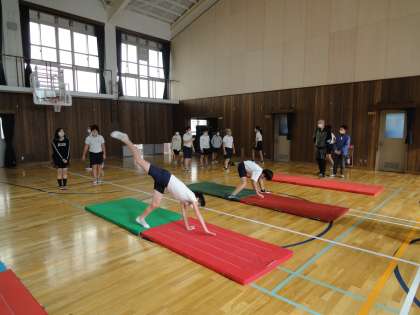 開脚前転・後転や側転,ロンダート,倒立前転など,一人ひとりが一生懸命に取り組む姿はとても良かったです。