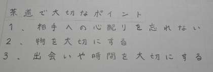 自主勉強の学習で、茶道について調べている子がいました。先週の茶道体験を通して、茶道について深く知りたいという思いを持ち、とてもうれしく思います。日本の伝統文化について、これからも関心を高めてもらいたいです。来週はジュニア京都検定を学校で行うので、体験を通して学んだ知識を是非、生かしてほしいです。