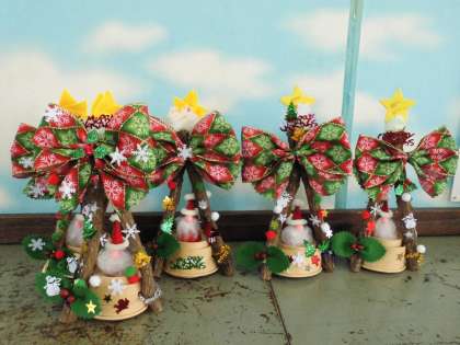 放課後まなび教室では、宿題や学習が終わってから、クリスマスの飾りを制作しています。南天の枝を組み合わせて作った土台に、リボンを結んで、雪だるまや星の飾りを工夫してつけていきます。