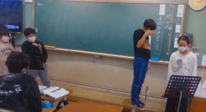 国語の学習で狂言「柿山伏」の音読発表会を行いました。初めは、狂言の独特の語りや烏や猿、鳶の演技に恥ずかしさを感じていましたが、学習を重ねるごとに、柿主と山伏の考えや気持ちが分かるようになり、動作や独特の語りを意識して一生懸命練習するようになりました。発表会では、工夫していて素敵な発表会となりました。