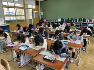 2年生の学習が始まっています。新しい漢字を見て、「画数が多い!」と驚いている子がたくさんいました。教室をのぞきに来てくださった校長先生から、「良い姿勢ですね。」と褒めていただいた2年生の子どもたち。これからも、良い姿勢で学習に取り組んでいきたいです。