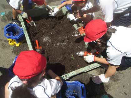 今日、生活科の学習でトマトの苗を植えました。たくさんの教職員の方にお手伝いをしていただきながら、子どもたちはとてもキラキラとした目で取り組みました。まずは1年生のころから育てていたチューリップの球根を取り出し、トマトの苗を植える準備をしました。次に肥料の入ったふかふかの土を入れて、トマトの苗を迎える準備をしました。苗をポットから取り出すときには「折れないように…。」「優しく優しく…。」と、とても大切にしている様子がとても素敵でした!