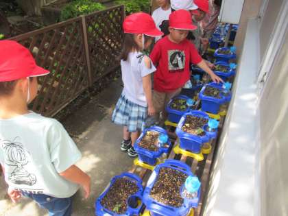 昨日はまだ芽が出ていない子もいましたが、今日はほとんどの子の植木鉢から芽が出ていて、子どもたちは大喜び。