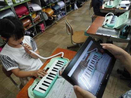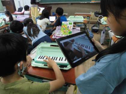 友だちに演奏している様子をタブレットで撮影してもらい、指の動きを確かめました。