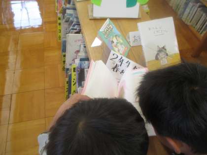 完成した春ブックは、図書館に置いていただいています。司書の先生から、「他の学年の人も、見ているよ。」というお話を聞き、嬉しそうにしていた2年生の子どもたちです。