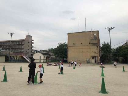 2年生が運動場でバトンリレーをしています。
