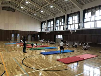 4年生は体育館でマット運動をしています。