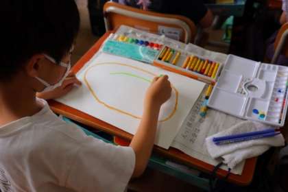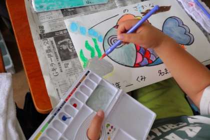 先週から絵の具を使っています。2回目の絵の具の学習にしては用意も早く感心しました!今回はパスを一緒に使ってみました。「すごい!きれい!」「絵の具がはじいた!」と子どもたちは楽しみながら、色を塗りました。その後には一人ひとりが考えた「ふしぎなたまご」を描きました。この「ふしぎなたまご」から何が生まれるのか楽しみでです。