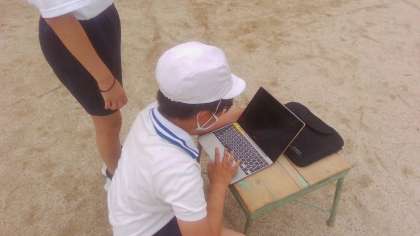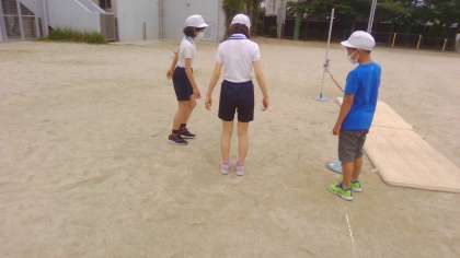 フォームの確認を動画で行ったり、歩幅を視覚化するために地面に線を引いたりと、工夫がみられました。また、協力して学習を進める様子がどのグループにもみられいろいろな学びが得られているのではないかと感じました。