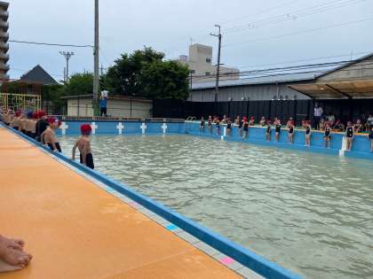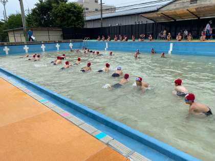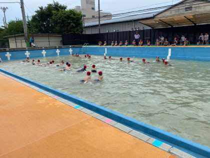 まずは低水位という、浅い水から慣れていくことをしています。今日は、水のかけあい、ワニ歩きをしました。久しぶりのプールに、大興奮の子どもたちでした。しかし、話を聞くときは、しっかりと聞き、監視の先生方に感心されていた子どもたちでした。