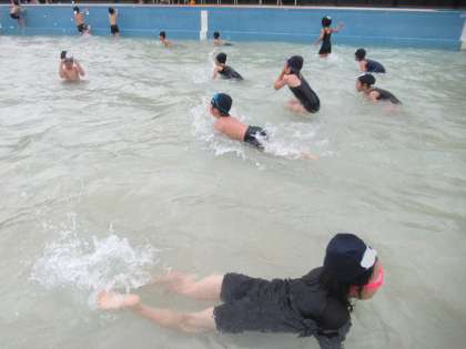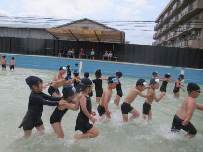 電車ごっこをしたり、かえる跳びをしたりして水慣れをしています。